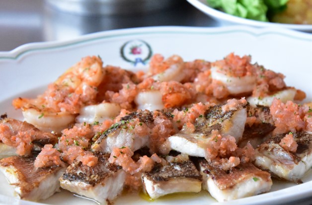白身魚のソテー、海老、焼き野菜